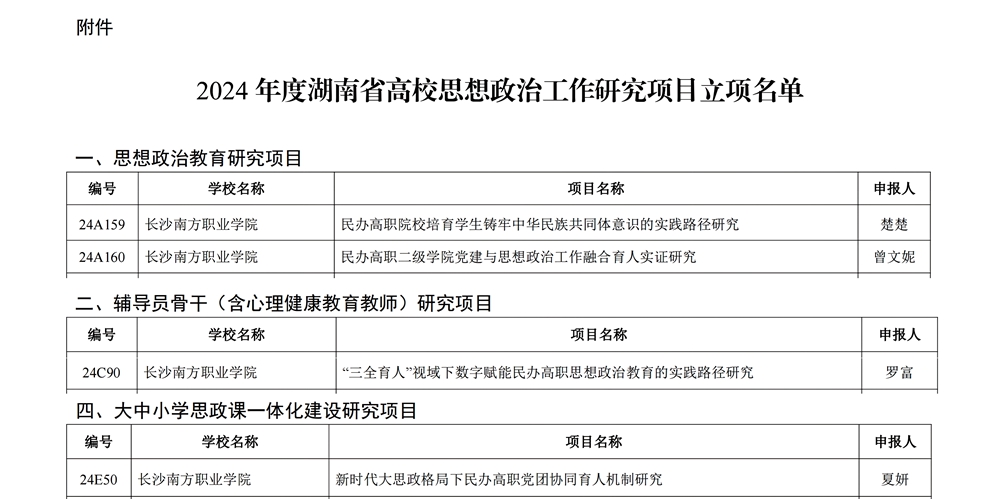 近日,中共湖南省委教育工委、湖南省教育廳《關(guān)于公布2024年度湖南省高校思想政治工作研究項(xiàng)目立項(xiàng)名單的通知》(湘教工委通[2024]27號)顯示,長沙南方職業(yè)學(xué)院成功立項(xiàng)思想政治教育研究項(xiàng)目2項(xiàng)、輔導(dǎo)員骨干(含心理健康教育教師)研究項(xiàng)目1項(xiàng)、大中小學(xué)思政課一體化建設(shè)研究項(xiàng)目1項(xiàng)。