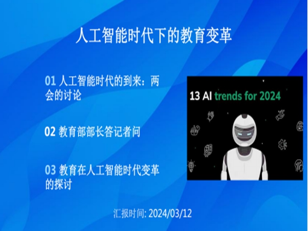 結(jié)合本次AI技術(shù)應(yīng)用培訓(xùn),3月12日龍?zhí)庨L(zhǎng)在教學(xué)例會(huì)上作了《人工智能時(shí)代下的教育變革》的講座。他基于自身對(duì)AI技術(shù)應(yīng)用的體會(huì),結(jié)合今年兩會(huì)專(zhuān)家關(guān)于“人工智能+教育”的討論,并借鑒南京大學(xué)開(kāi)設(shè)的人工智能課程、香港科技大學(xué)推出10位AI講師的經(jīng)驗(yàn),提出了“人工智能+教育”改革的相關(guān)問(wèn)題和改革思路。