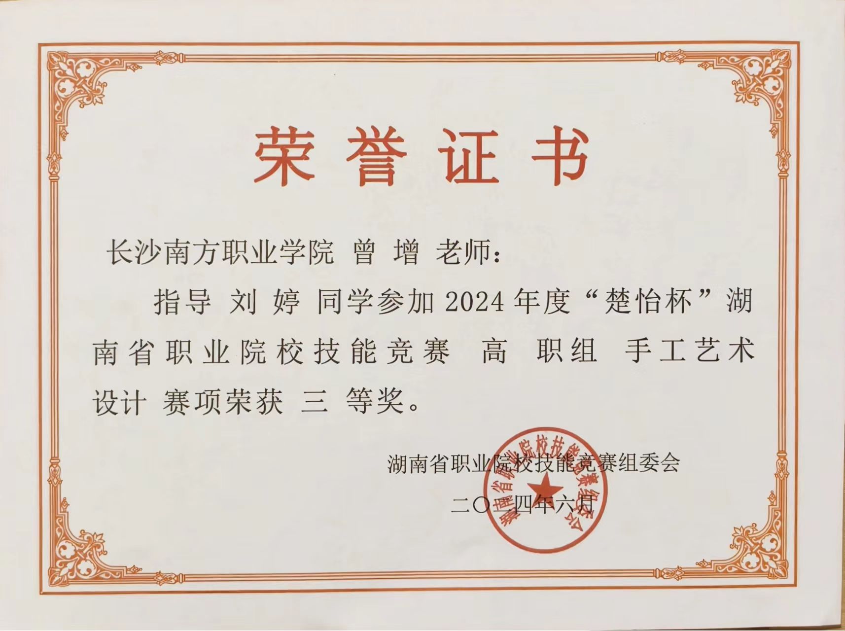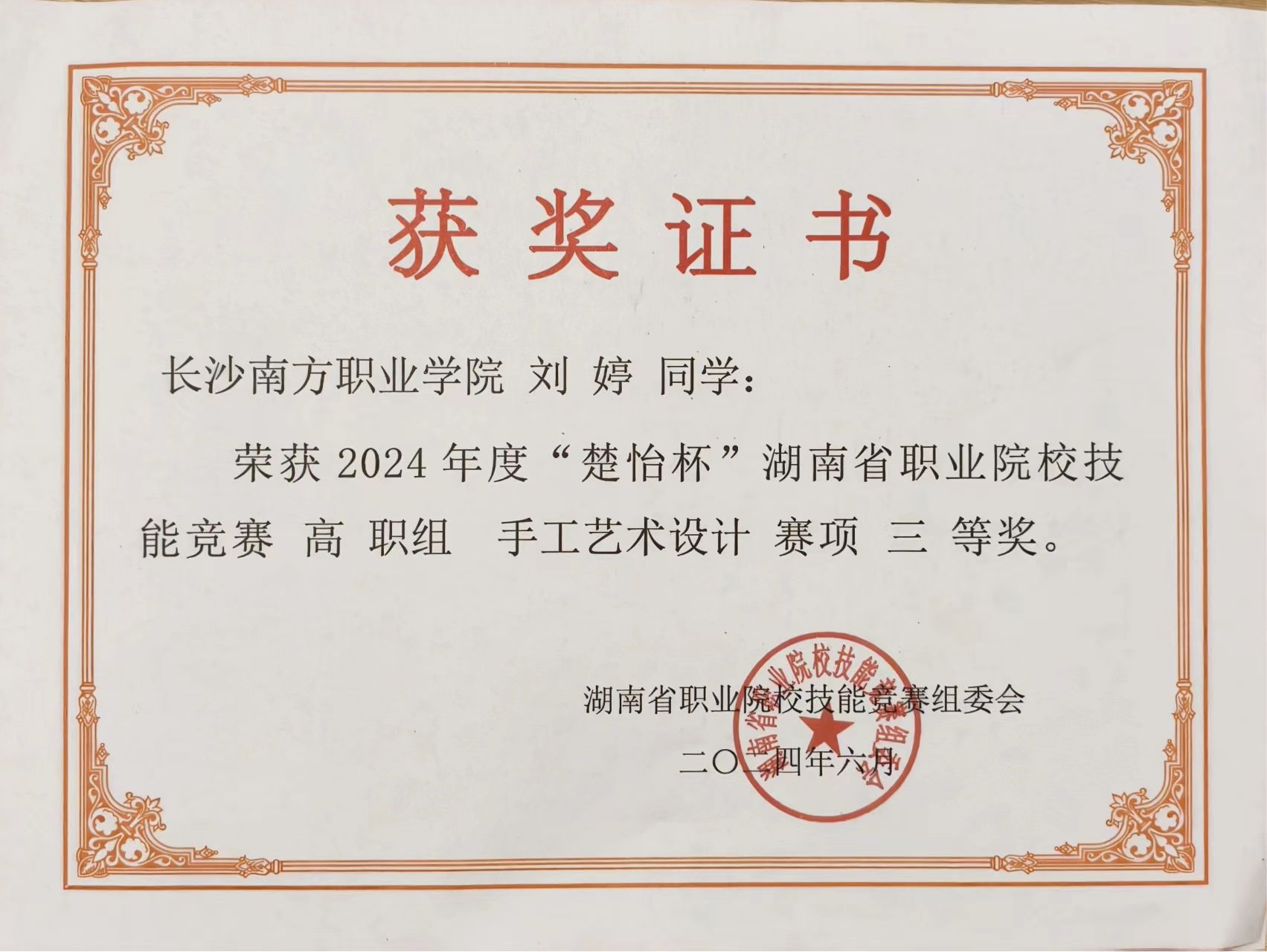 6月13日,2024年度“楚怡杯”湖南省職業(yè)院校技能競(jìng)賽手工藝術(shù)設(shè)計(jì)賽項(xiàng),在湖南幼兒師范高等專(zhuān)科學(xué)校落下帷幕,我院學(xué)生劉婷(建筑室內(nèi)設(shè)計(jì)專(zhuān)業(yè))榮獲該賽項(xiàng)三等獎(jiǎng)。