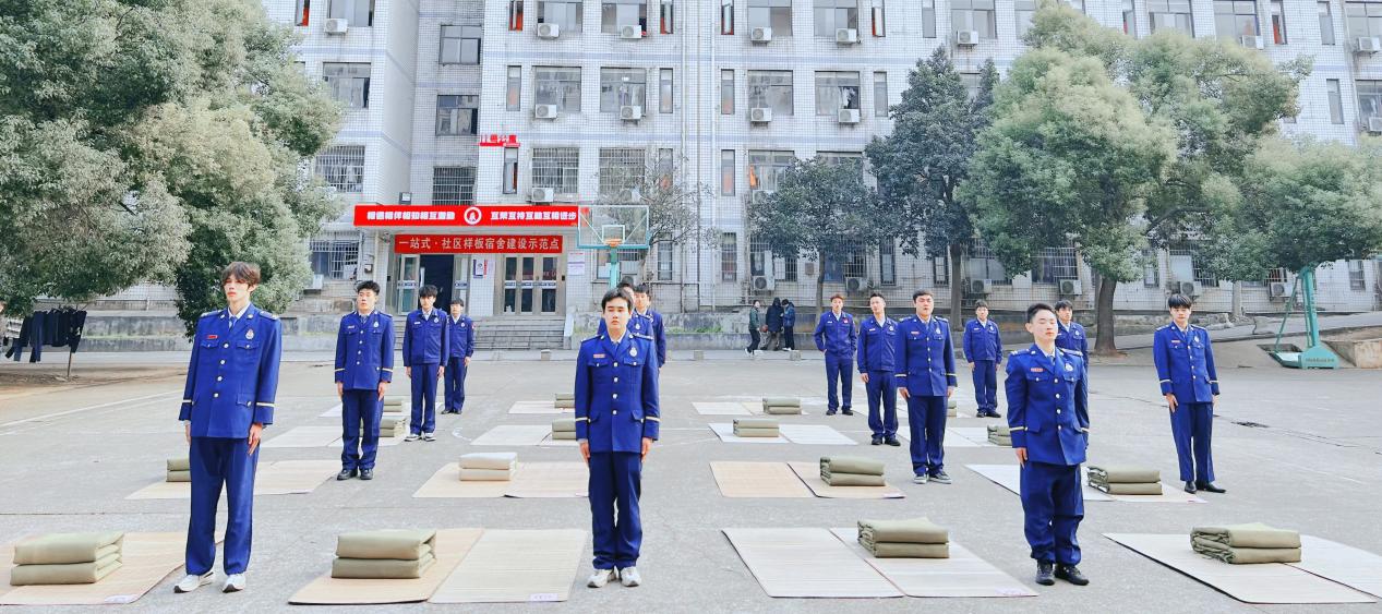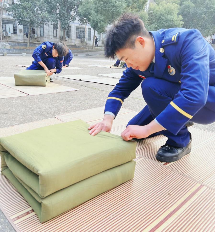 參觀考察結(jié)束后,消防專業(yè)內(nèi)務(wù)比武活動(dòng)在學(xué)校本部11棟前籃球場(chǎng)進(jìn)行。比賽規(guī)則為在規(guī)定時(shí)間內(nèi),運(yùn)用“疊、壓、折、擠、捋、修”等操作技能,完成“棉被”到“豆腐塊”的華麗轉(zhuǎn)變。