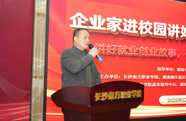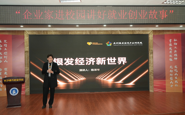 為響應(yīng)湖南省教育廳“企業(yè)家進(jìn)校園講好就業(yè)創(chuàng)業(yè)故事” 活動(dòng)號(hào)召,深化校企協(xié)同育人,激發(fā)學(xué)子創(chuàng)新創(chuàng)業(yè)活力,12月18日,我校聯(lián)合湖南湘江新區(qū)大學(xué)生就業(yè)創(chuàng)業(yè)服務(wù)中心,在學(xué)術(shù)報(bào)告廳成功舉辦主題講座。亞洲銀發(fā)經(jīng)濟(jì)產(chǎn)業(yè)研究院院長(zhǎng),花樣智慧養(yǎng)老集團(tuán)創(chuàng)始人,晚安集團(tuán)執(zhí)行總裁陳澤岑受邀擔(dān)任主講嘉賓,學(xué)校副校長(zhǎng)肖建偉、湘江新區(qū)大學(xué)生就業(yè)創(chuàng)業(yè)服務(wù)中心李俊主任及300余名師生共同參與,現(xiàn)場(chǎng)氛圍熱烈。