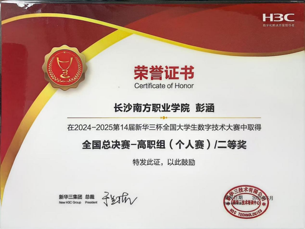 近日,第14屆新華三杯全國(guó)大學(xué)生數(shù)字技術(shù)大賽——全國(guó)總決賽在杭州圓滿落下帷幕。我校由張德平老師指導(dǎo)的2023級(jí)計(jì)算機(jī)網(wǎng)絡(luò)技術(shù)專業(yè)學(xué)生彭涵憑借扎實(shí)的技術(shù)功底與創(chuàng)新實(shí)踐能力,從全國(guó)千所院校的4萬(wàn)余名參賽者中脫穎而出,榮獲全國(guó)總決賽-高職組(個(gè)人賽)二等獎(jiǎng)。這是我校深化“以賽促學(xué)”理念的又一碩果,更是學(xué)生專業(yè)實(shí)力的閃耀見(jiàn)證。