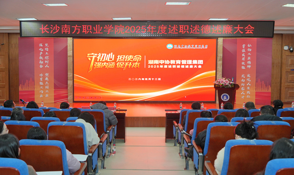 為深入貫徹落實立德樹人根本任務(wù),客觀準(zhǔn)確地評價領(lǐng)導(dǎo)干部年度履職成效,強化干部隊伍建設(shè),激勵擔(dān)當(dāng)作為,2026年1月12日上午,長沙南方職業(yè)學(xué)院召開2025年度述職述德述廉大會。會議以“守初心擔(dān)使命 強內(nèi)涵促升本”為主題,通過嚴(yán)肅規(guī)范的述職評議,全面檢驗工作成效,凝聚發(fā)展共識,為學(xué)校“升本”戰(zhàn)略和內(nèi)涵式高質(zhì)量發(fā)展注入強勁動力。湖南中協(xié)教育管理集團(tuán)考核組領(lǐng)導(dǎo)、學(xué)校全體校領(lǐng)導(dǎo)、中層干部及教職工代表參會。
